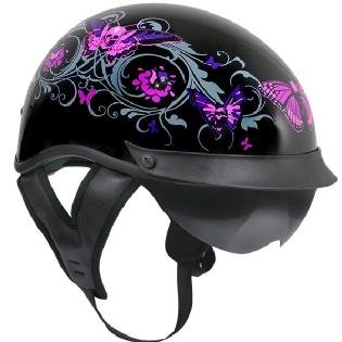 Outlaw T-72 Dual-Visor Glossy Motorcycle Half Helmet with Graphics of Flowers and Pink Skull Butterflies This Outlaw half-helmet features glossy graphics depicting flowers and skull butterflies on black background. The helmet has a wet, glossy finish, a bolted removable sun visor and a drop-down retractable smoke shield. Item Details Glossy-finish polycarbonate shell Black as main background color Graphics of skull butterflies and flowers Drop-down shield: retractable, easy push-and-pull, high-definition Removable bolted visor Non-removable DOT and Outlaw graphics on the back Comfortable slim plush EPS liner Double D-ring retention system DOT-approved